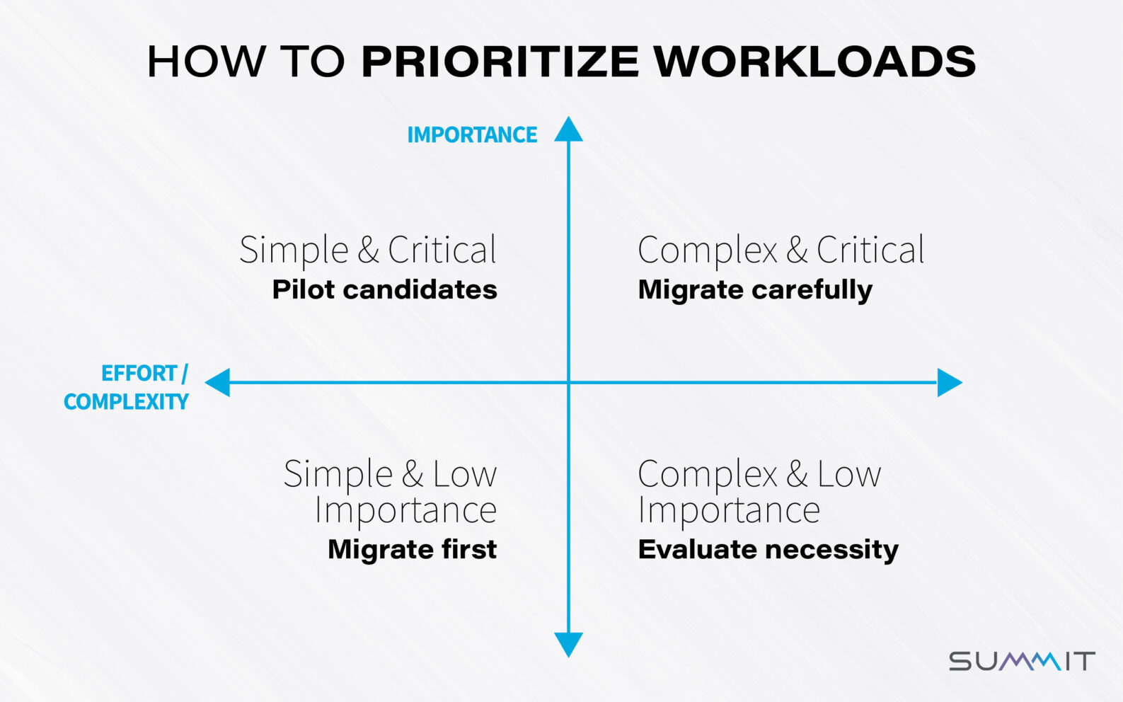 So where do you start? We’ve found it’s helpful to prioritize workloads on two axes: migration effort / complexity and business importance (see diagram).