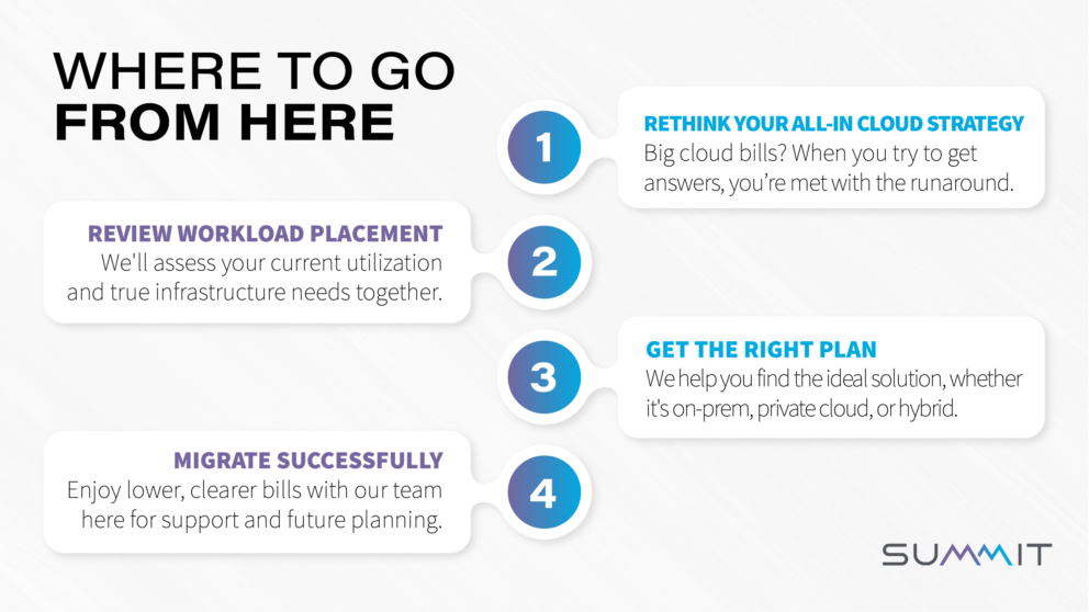- Ask whether you’re in the right place. Whether it’s a massive cloud bill, an unexpected outage, lagging performance, or murmurings you’re hearing about hybrid capabilities, follow your instinct to question your strategy if you’re all-in on the public cloud. Starting the conversation is the first step to ensuring your infrastructure is optimized for growth.