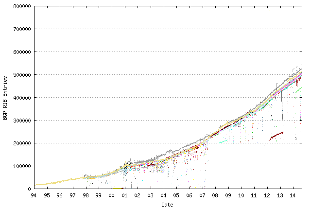 The number of devices connected to the Internet has exploded in the last ten years. This, coupled with the de-aggregation of the global Internet routing table, has caused an increase from just over 100,000 routes in the early 2000s to over 500,000 routes in 2014.